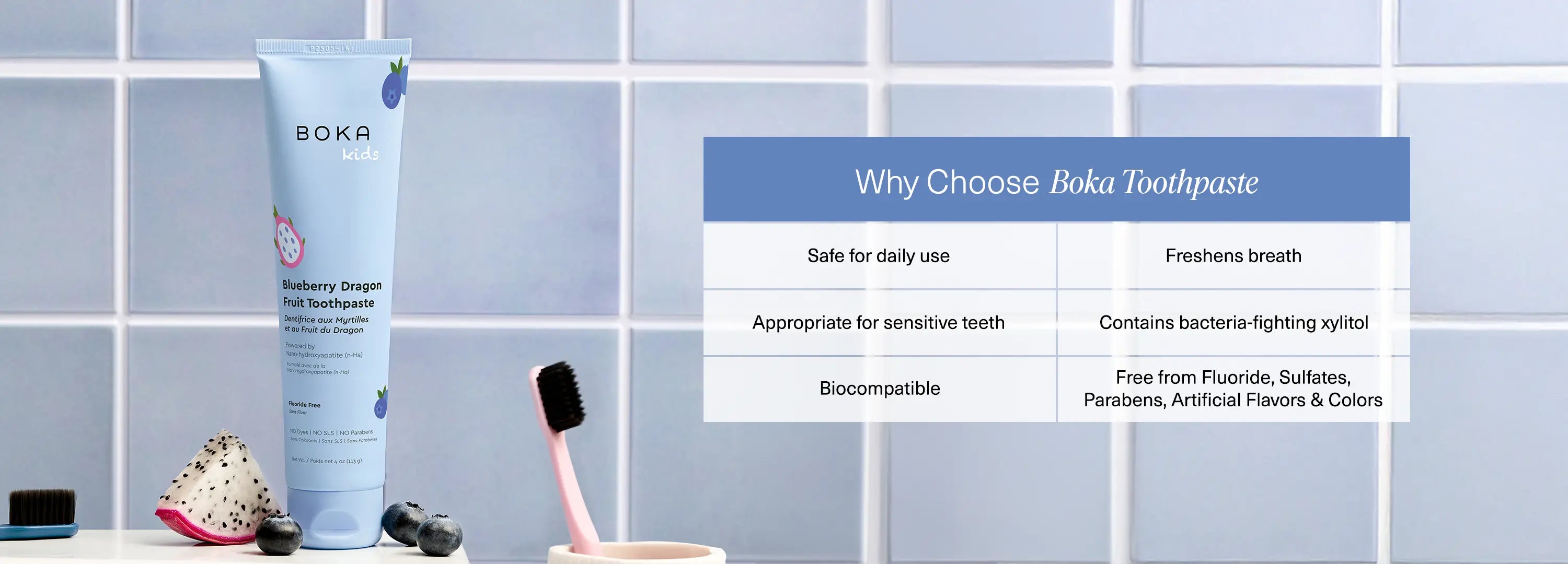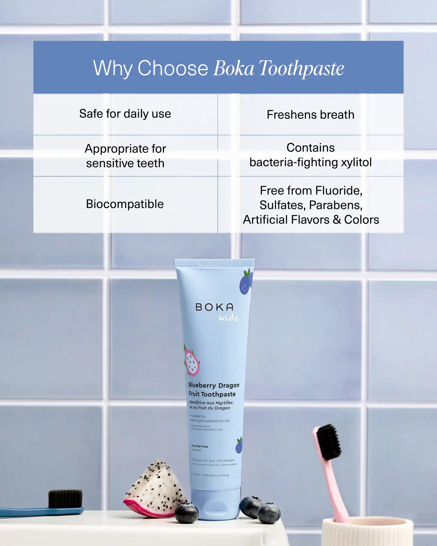 Bring home Boka’s Blueberry Dragon Fruit flavor for a fun way to brush! With science-backed ingredients, it’s perfect for keeping kids’ teeth fresh and clean.
